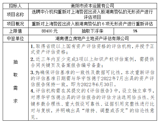 选聘中介机构重新对上海贽匠出资入股湖南贽弘的无形资产进行评估项目抽取结果公示